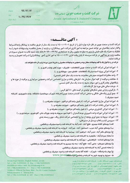 شرکت کشت و صنعت جوین در بهمن ماه 1354 به شماره 1212 در اداره ثبت شرکتها و مالکیت صنعتی تهران به نام شرکت قند جوین (سهام خاص) به ثبت رسید و به مجمع عمومی فوق العاده مورخ 26 دی ماه 1355 صاحبان سهام تغییر یافت.