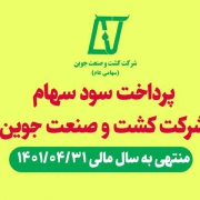 ضمن تبریک فرا رسیدن عید قربان به اطلاع کلیه سهامداران حقیقی و حقوقی شرکت کشت و صنعت جوین می رساند؛ سود سهامداران حقیقی و حقوقی مربوط به سال مالی منتهی به 31/04/1401 از طریق شرکت سپرده گذاری مرکزی( سجام) در مورخ 04/04/1402 به حساب سهامداران محترم واریز گردید.